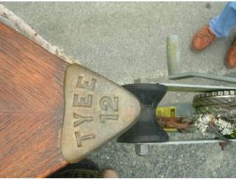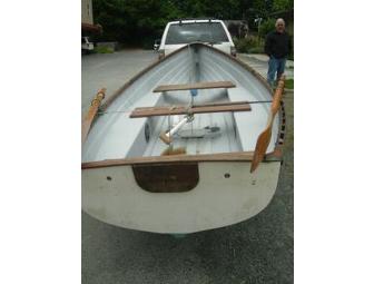 The boat was built in 1993 but has been very lightly used and is in great shape. This particular model was called a Tyee-12 at the time it was made; it is now marketed as a Westcoast 11'6" rowboat. It is made from fiberglass, with teak trim, and is rigged to use with either a small outboard motor or spoon oars. There are potentially two rowing spots, but the donor says that it works best with only one rower. The oars come with the boat; the outboard motor does not!