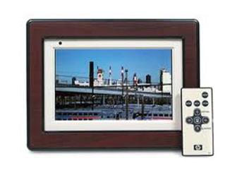 HP 7" Digital Picture Frame (df710c2). Solid wood frame with 3 extra mats. No PC required. Easy to Use. Take A Picture, Insert The Card, Enjoy! Features widescreen display, arlarm clock, calendar display, audio with built in stereo speakers, auto rotate capability, a remote control, and more!