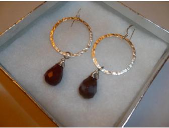 14K Silver filled hammered hoops & earwires with faceted marroon glass tear drops.