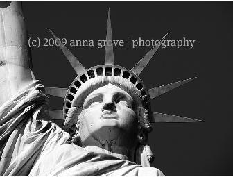 A black and white close-up photograph of the Statue of Liberty with mat, mounted on foam board. Parameters: the photo is unframed, mat is approx. 20"x16" containing approx. 16"x10" photo (horizontal display). Donated by Anna Grove Photography.