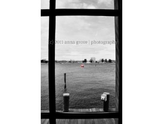 A black and white photograph of a little red sailboat in the distance viewed through a window (using selective coloring). Comes with mat and is mounted on a foam board. Signed by the artist. Parameters: the photo is unframed, mat is approx. 16"x20" containing approx. 10"x16" photo (vertical display). Donated by Anna Grove Photography.