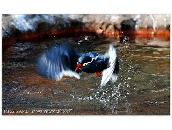 A color photograph of a Peruvian Inca Tern bird touching the water surface with its wings creating droplets in the air. Comes with mat and is mounted on a foam board. Signed by the artist. Parameters: the photo is unframed, mat is approx. 20"x16" containing approx. 16"x10" photo (horizontal display). Donated by Anna Grove Photography.