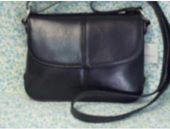 This black Liz Claiborne bag has magnet snap closure with one zippered compartment inside. Double stitching wraps the bag with just a hint of detailing. The adjustable strap may be used as a shoulder strap or across the body or as a handle.. It measures 6" X 8" X 2".