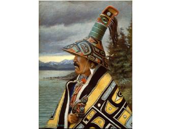 A Tlingit village chief watches the approach of his invited guests arriving by canoe. He is the custodian of noble emblems that attest to the aristocracy of his lineage. Primary among these is a painted spruce root hat, topped with a column of basketry cylinders supporting the carved figure of the fin of the killer whale. The hat painting depicts the whale itself, blowhole represented by a human face with its body streaming back as the whale’s breath. Clan crest hats are the royal crowns of Tlingit nobility, to be worn only on occasions of the greatest importance. In this way, the inviter honors his guests.