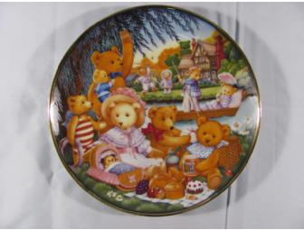 “A Teddy Bear Picnic” is a beautifully executed gilded plate by artist Carol Lawson.
