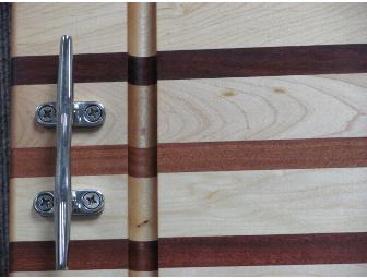 This steak board is hand crafted out of American hard maple and Santos mahogany and a must have for every home! It features 2 Herreshoff style 6” stainless steal cleats and is the perfect nautical accent but sure to please any host. It measures 15 x 24 x 1” there is also an ample ¾” juice groove to handle any serving requirements.