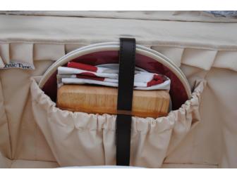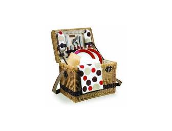 Quality woven willow suitcase-style picnic basket by Moka comes fully loaded with plates, silverware, wine glasses, napkins and table cloth, cutting board and corkscrew. Perfect for a picnic at the park!