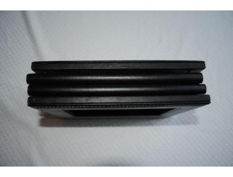 Black, leather desk top photo album. Two mini 4"x6" photo albums allow you to change the photo display. Perfect for the office!