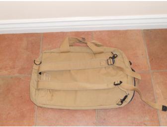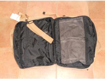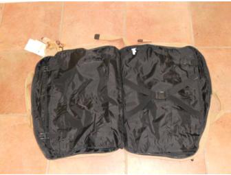 This beautiful Kipling carry-on bag is loaded with compartments for all your travel essentials. Convenient zip-around closure. Inside, there are two large mesh zipped pockets, two other open compartments and a large separate section with elastic tie-down straps to hold everything together. There are two large zipped pockets on the front and of course, the furry Kipling monkey keyhanger. Short carry handles, a versatile shoulder strap that's both adjustable and removable, and backpack straps with a hide-away compartment. Fabric is water-resistant Nylon in a versatile dark khaki color. Approximately 20”x13”.