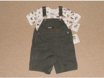 Cute dark green shortalls with gecko-themed onesie in size 24 mos. Gecko is also embroidered on the front center pocket.