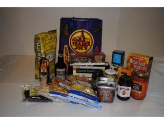 A yummy reuseable bag from Trader Joes, including olive oil, vodka sauce, penette pasta, pistachios, chocolate covered raisins, crackers, marinated artichokes and MORE.