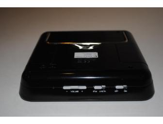 This Leeds iPod travel speaker is a self contained musical output device. The speaker features a collapsible stand and is powered by four AA batteries. Place your iPod or iPhone into the face of the device.