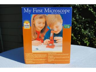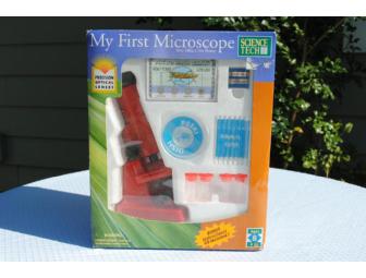 My First Microscope by Science Tech is a 39 piece set that includes 1 microscope (80x-100x-120x power), microdata bank, 8 blank slides, 12 statical slide covers, 12 blank labels, 4 collecting vials, 1 petri dish and an instruction manual. Designed with the younger scientist in mind, it has large oversized knobs. For ages 8 and up.