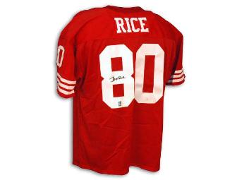 This red and white 49ers jersey is signed by football great Jerry Rice, right next to the famous #80. It has a special patch on it, commermorating the 49ers 50 years of football in San Francisco. Grab your chance to have this special signed jersey from the greatest wide receiver ever and of the greatest players in NFL history!