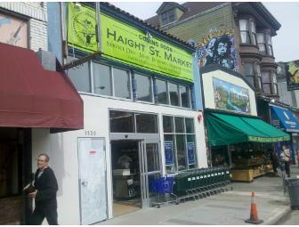 Here's a $40 gift card to spend at the newly expanded, locally owned Haight Street Market. This local favorite has always had wonderful produce and local dairy. But now they've got one-cup-at-a-time fresh brewed Blue Bottle Coffee and fresh fish and meats and a deli counter with lunch meats and delicious ready-made salads. Stop by and check out this family-owned business right near school.