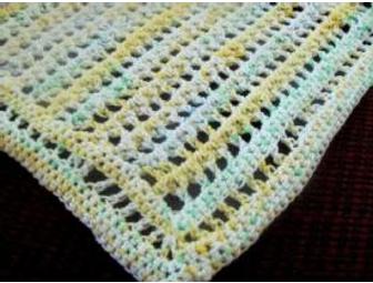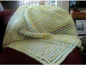 Airy 40" x 50" handmade afghan in Bernat's "Baby Jacquard" yellow, green and white yarn.