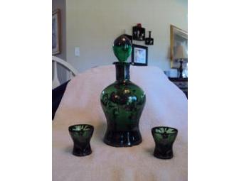 Beautiful green glass decanter with stopper and two shot glasses with silver overlay. Some wear on the silver overlay noted on the stopper, but otherwise in very good shape. Decanter measures approximately 9" tall with stopper. Shot glasses measure 2" tall.