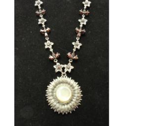 This necklace was designed in Bali, Indonesia in .924 silver. The leaves are inset with garnets of oval shape and the flowers have small round garnets in the center. Each tiny flower petal is intricately carved to make the whole. The silver pendant is designed like a sunflower with a polished mother of pearl round center.