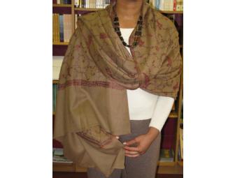 Deep caramel colored fine wool shawl hand loomed in Kashmir. The embroidery is done in silk thread in shades of light and dark brown with a touch of pumpkin and dark sage. The pattern is a stylized paisley with delicate vines and flower motifs. This shawl is fully embroidered with a border to finish off the two ends. A luxurious shawl to have and to wear. Has a beautiful drape to it. You will love this one!