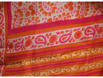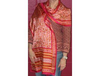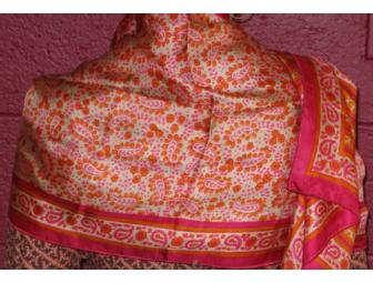This stunning scarf may be worn as a wrap, or a scarf to grace any outfit from very dressy to casual dressy. The timeless paisley is block printed in Hot Pink, Red and Mustard on a Beige background with mustard to grace paisleys and the borders on the two short sides. A must have!