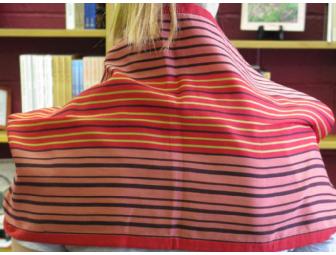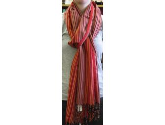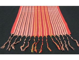 Hand loomed cotton and silk scarf in red, gold, black and peach with beaded tassels on the end.
