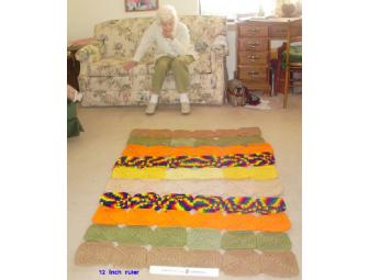 This is a 10 x 6 motif afghan made by my mother, Natalie Bissell and myself together. The motifs are all made. The first four rows repeat in dark brown, green orange and rainbow colors. The inner two rows are light brown and yellow motifs. The overall size is approximately 5 feet by 3 feet