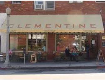 Gift certificate for a meal for two at Clementine. Clementine is a family-owned neighborhood bakery-cafe specializing in pastries, fresh salads, entrees and soup, all made from scratch with seasonal ingredients.