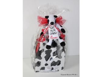 Chick-fil-A package which includes dinner for four, travel mug, backpack and stuffed cow