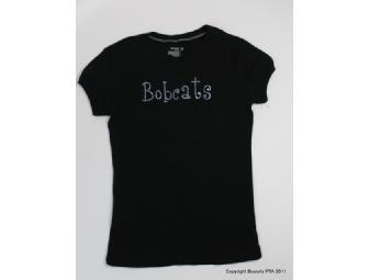 Black short sleeved size medium kids shirt with "Bobcats" in clear jewels