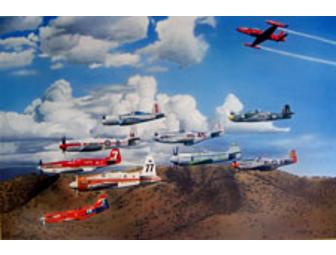 As the nine Unlimiteds charge down the “chute” at maximum power, the T-33 pace plane, leaving a marking trail from its wingtips, pulls up and away, beginning what some consider (for those who have witnessed it), the most exciting moment in all of motor sports racing, even including the start of the “Indianapolis 500”. This was the inspiration behind the piece created here, which depicts the beginning of the Unlimited Championship Final at the 1991 Reno Air Races. Former two-time Unlimited Champion, Steve Hinton, pilots the T-33 Red Knight pace plane, as another former Unlimited Champion, John Crocker, rides along as a passenger in the back seat. Gentlemen, you have a race!