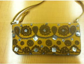 Spoil yourself with this stylish beaded and sequin mustard colored handbag from Noir et Blanc...bis.
