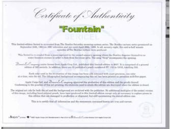 NOW'S YOUR CHANCE TO OWN A SERICEL OF CRITICALLY ACCLAIMED BAND THE BEATLES! This sericel is recreated from a scene captured in the second season's opening where the Beatles disguise themselves as water fountain statues in order to hide from fan crazy girls! "Fountain" is a limited edition sericel, based on the Saturday Morning cartoon series The Beatles. Includes Certificate of Authenticity, and has the official DenniLu Company Stamp. Measures Approx: 13.5" X 13.5". Listprice: $350.00
