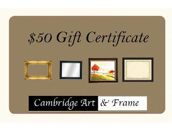 You're bidding on a $50 gift certificate from Cambridge Art & Frame. Certificate can be used for any picture, mirror, artifact, tapestry, or canvas framing. (See Terms and Conditions)