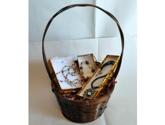 With this basket you receive a jewelry trio by Diane's Designs, a colorful stretch to wear bracelet, jeweled 16” silver necklace of ocean blue stones, and a multi color beaded 26” necklace featuring a silver cat charm.