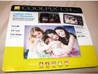 Nikon CoolPix L24 digital camera has 14.0 MP, 3.0" clear LCD, 3.6x zoom, 3-Way VR image stabilization system. Will record movies (TV quality). ISO 1600. Accessories included: 2 AA batteries, USB Cable UC-E6, wrist strap, Nikon ViewNX 2 CD_ROM.