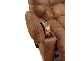 This Lane Barley Recliner model # 11959159721 donated by Conn's, is the perfect way to watch the big game. In recliner position solid foam pads provide support behind the knees for head to toe support and comfort. Its long lasting fabric is cleanable and stain resistant. Outlasts regular fabrics 2 to 1. Not to mention it allows for magazine and remote storage and has a cup holder for drinks. You'll have the best seat in the house!