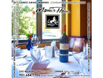 Enjoy a $75 gift certificate to dine at the highly rated 5 star Riverside restaurant, Mario's Place which serves Northern Italian Contemporary Cuisine.
