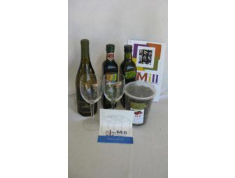 Gift Basket from The Mill includes a $25 dining gift card, The Mill's special makings for Passion Fruit Tea, a bottle of Leonesse Cellars (Temecula) 2008 Viognier red wine, 2 wine glasses, Balsamic Vinegar and Trader Joes Extra Virgin Olive Oil