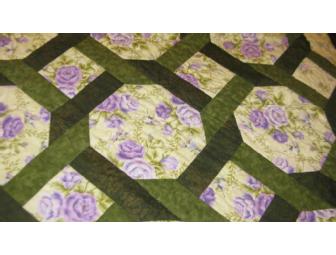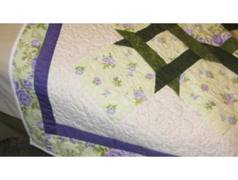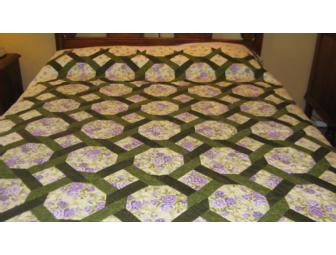 Heirloom quality quilt, machine pieced and hand quilted in 2010. This 80" by 98" (Queen or King size) gorgeous quilt has lavender and greens as the dominant colors.