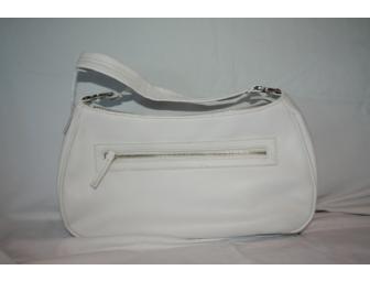 Simple yet sophisticated; this elongated white handbag has a side zipper for convenience and a perfect sized strap for under the arm comfort. Designed by MOSS