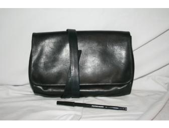 This Calvin Klein clutch handbag is made from soft black leather with a flap top. Enclosure is an unconventional vertical strap that wraps the bag closed. Modern and unique for a vintage Italian made Calvin Klein.