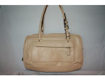 Vintage Style Cream Bowling Bag with brown trim, dual rolled handles, full length zipper, and front zipper pocket. Maroon cotton interior with pockets. Gently used and in good condition