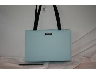 Put some spring in your step with this adorable Kate Spade! Spotless baby blue exterior, colorful stripes line the interior, dual black handles, and silver feet to prevent damage or discoloration. Rarely used and in superb condition.