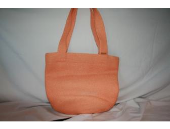 Signature lightweight and durable bucket tote from Eric Javits in tangerine. Used and in excellent condition, this tote features a bright, complementary green cotton lining and magnetic snap enclosure.