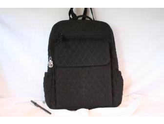 Vera Bradley plush black fabric backpack. Magnetic front pouch, zipper front pocket, dual side pouches, and large main compartment with full zipper.