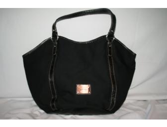 Tommy Hilfiger black vinyl tote with leather trimming and silver accents. Dark blue sateen interior with wall pockets.