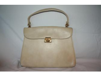 Vintage Calderon double opening cream leather handbag! Gold hardware, turn-key enclosures on each side, flat modern shape.
