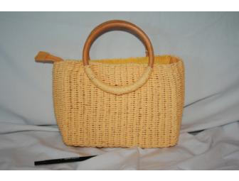 Little yellow woven handbag is cute, fun and frisky. This wood-handled bag is the perfect summer color to get out and have some fun.