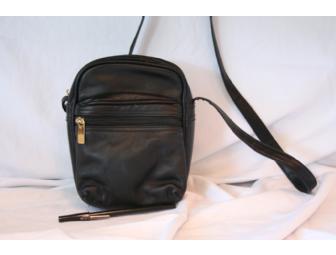 Black leather single strap camera-bag style purse by Worthington. Small, efficient and durable with gold accents.
