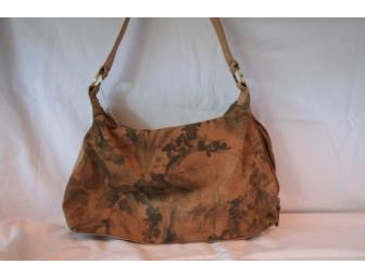 Subtle floral impressions enhance the beauty of this suede leather single strap purse with brass accents.